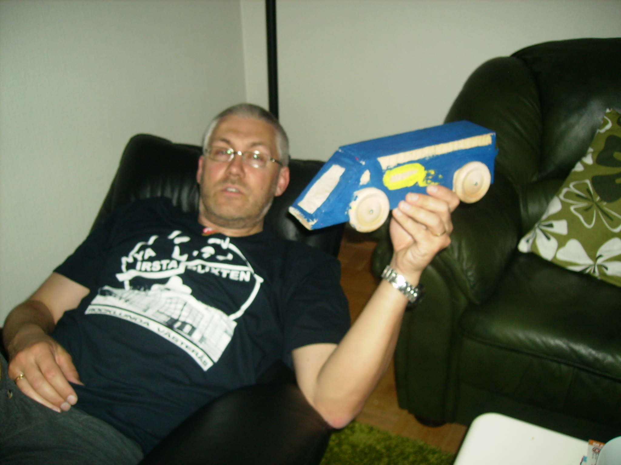 I dag på första hemturen kom en liten kille och lämnade över en buss som han hade gjort i träslöjden. Bussen är blå och det står Axelssons med gult på sidorna och den står nu framme vid vindrutan i bussen. Tack Filip!! 🙂