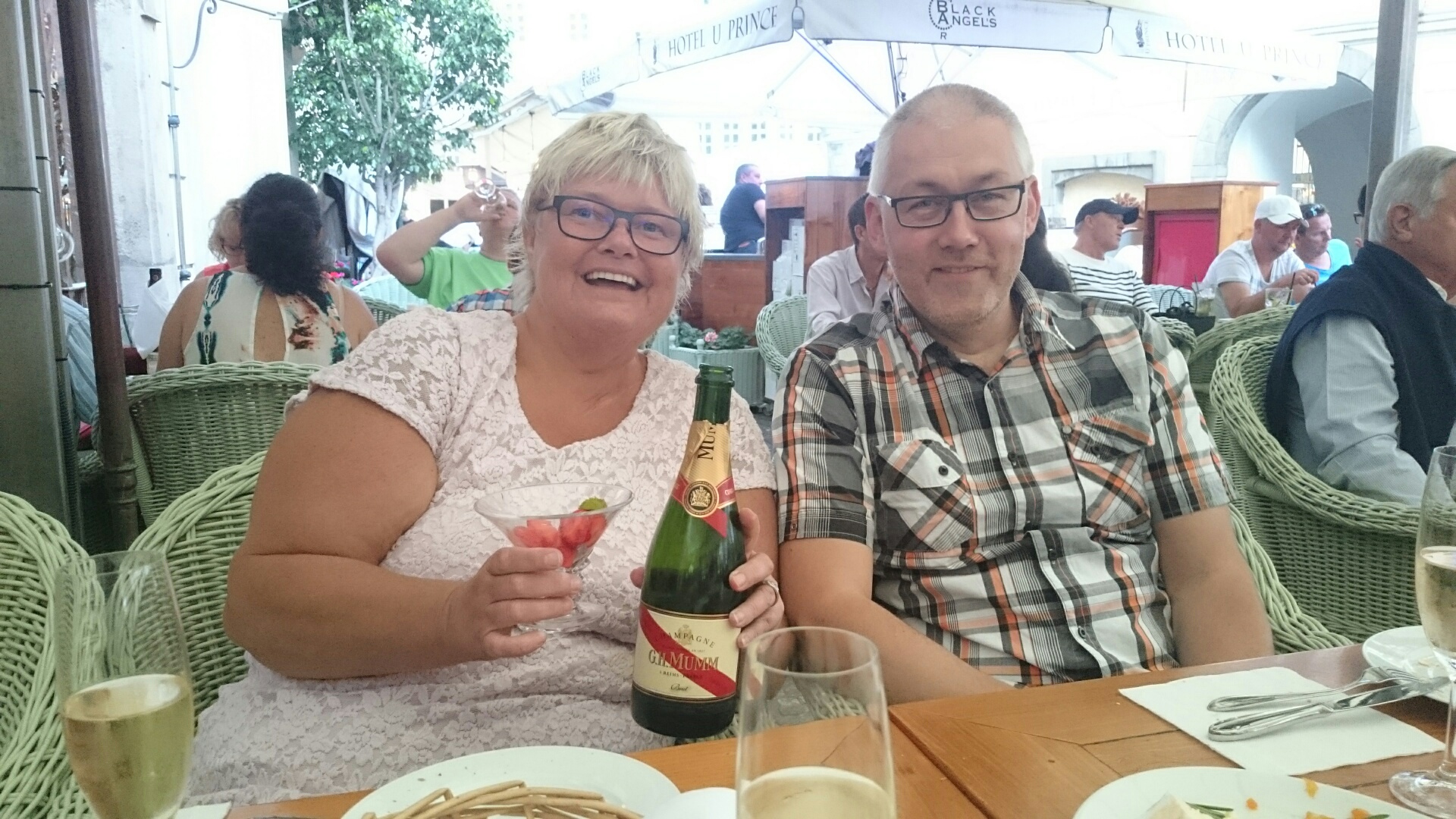 Nu hade vi fyra lugna dagar tillsammans i Tjeckiens mysiga huvudstad. Vädret var perfekt för sightseeing och vandring i stadskärnan – inte för hett och ingen nederbörd dagtid. Det kom lite sommarregn första kvällen när vi var på väg tillbaka till hotellet och en rejäl åskskur under Maries födelsedagsmiddag på Hotel U Princ vid torget i Gamla Stan, men då satt vi som tur var under vattentäta markiser 🙂